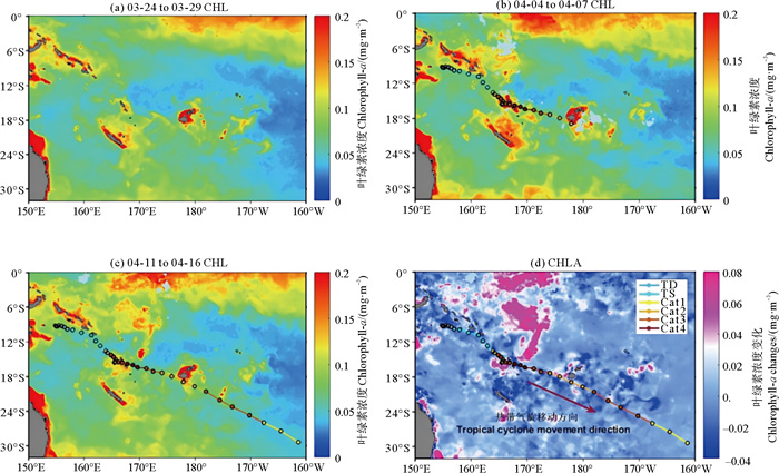 图 5 Harold过境前后海表叶绿素浓度((a)—(c))及叶绿素浓度(d)的变化 Fig. 5 Change of sea surface Chlorophyll-a concentration ((a)—(c)) and Chlorophyll-a concentration (d) before and after the passage of tropical cyclone Harold |