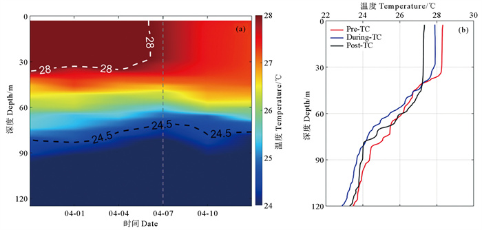 ( (a)Harold过境期间(3月29日—4月13日)上层海洋温度随深度变化的剖面图,白色虚线为28℃的等温线,黑色虚线为24.5℃的等温线,灰色虚线为Argo浮标距离热带气旋路径点位置最近的过境日期(即4月7日);(b)Harold过境前(4月4日,红色实线)、过境时(4月7日,蓝色实线)、过境后(4月10日,黑色实线)上层海洋温度随深度变化的曲线图。(a) Profiles of depth-dependent changes in upper ocean temperature during Harold′s transit (March 29—April 13, 2020), white dashed lines represent the 28℃ isotherm, black dashed lines represent the 24.5℃ isotherm, gray dashed lines represent the closest approach date of the Argo float to tropical cyclone Harold′s path (April 7, 2020); (b) Upper ocean temperature profiles as a function of depth before (April 4, red solid line), during (April 7, blue solid line), and after (April 10, black solid line) the passage of tropical cyclone Harold. ) 图 6 编号为6903024的Argo浮标在Harold过境前后观测到的上层海洋温度随深度的变化 Fig. 6 Upper ocean temperature profiles observed by Argo float 6903024 before and after the passage of tropical cyclone Harold |