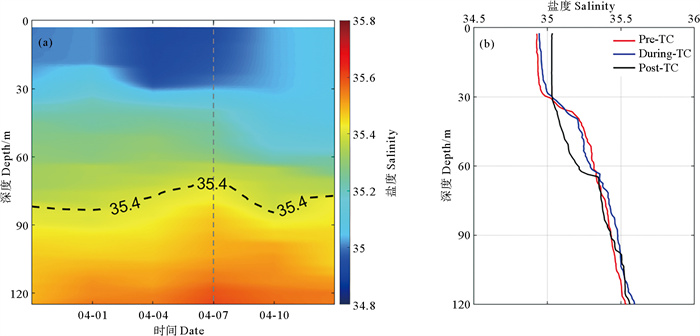 上层海洋盐度剖面变化如图 7所示,Harold过境前,上层海洋0~30 m深度内盐度较为均一,平均盐度约为34.9;从30 m深度开始盐度迅速增加,约在30~40 m之间形成一个小的盐度跃层。Harold过境后,上层海洋0~30 m深度内的平均盐度上升至35.2,相较于过境前,盐度明显增加了0.3。同时,30~60 m深度内的盐度显著减少,而60 m以深的海洋盐度并未产生显著变化,原有的盐度跃层消失,并在60 m深度形成一个极小的盐度跃层(见图 7(b))。在4月7日前后,水深80 m位置处的35.4等值线明显向上抬升(见图 7(a))。不同于上层温度响应,盐度不仅受到混合扰动作用影响,也受蒸发降雨影响,且响应不会立即停止,与过境前相比,Harold过境后上层海洋0~30 m深度处的最大增盐幅度为0.3,即热带气旋过境后几天内(4月10—13日)表层海洋的盐度增加最为显著(见图 7(b))。整体而言,Harold造成了观测海域上层增盐、次表层减盐的垂向结构异常。