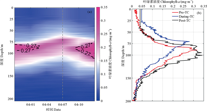 上层海洋叶绿素浓度剖面与温度、盐度剖面响应略有不同,如图 8(a)所示,海洋中的次表层在75~130 m深度处整体叶绿素浓度最大,平均叶绿素浓度大于0.25 mg·m-3,这主要是浮游植物集中在真光层的缘故。Harold于4月7日过境时,上层海洋60~80 m深度处整体叶绿素浓度约为0.2 mg·m-3,相较于Harold过境前(3月29—4月4日)、过境后(4月10—13日),呈现明显向表层抬升的现象。从垂向上看,在上层海洋0~75 m深度处,叶绿素浓度随着深度的增加而增加,平均叶绿素浓度由0.04 mg·m-3增加到0.19 mg·m-3,平均增幅达0.15 mg·m-3。在4月7日75 m深度处,叶绿素浓度达到最大值0.26 mg·m-3;而在上层海洋75~200 m深度处,叶绿素浓度随着深度的增加而减小,平均叶绿素浓度由0.19 mg·m-3降低到0.02 mg·m-3,平均降幅达0.17 mg·m-3;这表明浓度较高的叶绿素集中在上层海洋75~130 m深度处(见图 8(b))。