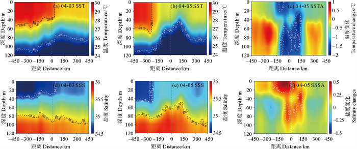 ( 垂直断面位置处为12°S—19°S、163°E—168°E;横坐标表示垂直于热带气旋前进方向相对于热带气旋路径点的距离(单位:km),负数表示路径左侧,正数表示路径右侧,灰色虚线表示热带气旋路径点的中心位置。((a)—(b))4月3日、4月5日上层海洋温度,白色虚线为25 ℃等温线,黑色虚线为28.5 ℃等温线;(c)4月5日上层海洋温度变化,白色虚线为降温1.6 ℃等温线;((d)—(e))4月3日、4月5日上层海洋盐度,白色虚线为34.7等值线,黑色虚线为35.5等值线;(f)4月5日上层海洋盐度变化,白色虚线为增盐0.3等值线。12°S—19°S、163°E—168°E at vertical section location, horizontal axis represents the distance perpendicular to the tropical cyclone′s path relative to the storm′s track points (unit: km), negative values represent the left side of the tropical cyclone′s path, positive values represent the right side of the tropical cyclone′s path, gray dashed lines represent the center position of the tropical cyclone′s path points. ((a)—(b)) Upper ocean temperature (April 3 and April 5, 2020), white dashed lines represent the 25 ℃ isotherm, black dashed lines represent the 28.5 ℃ isotherm; (c) Upper ocean temperature changes (April 5, 2020), white dashed lines represent the 1.6 ℃ cooling isotherm; ((d)—(e)) Upper ocean salinity (April 3 and April 5, 2020), white dashed lines represent the 34.7 isoline, black dashed lines represent the 35.5 isoline; (f) Upper ocean salinity changes (April 5, 2020), white dashed lines represent the 0.3 increased salinity isoline. ) 图 9 Harold过境时(2020年4月3日、5日)经过垂直断面位置处上层海洋温度、盐度及温盐变化随深度的变化 Fig. 9 Vertical profiles of temperature, salinity and temperature-salinity variations with depth in the upper ocean at the location of the vertical section at the time of Harold′s transit (April 3 and April 5, 2020) |