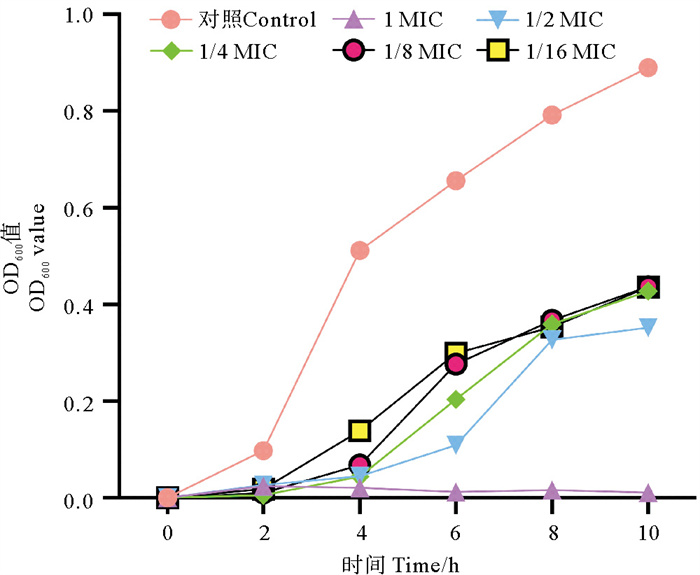 2.2 生长曲线的测定结果黄芩苷对嗜水气单胞菌生长的影响如图 1所示。0~4 h嗜水气单胞菌生长迅速,菌体密度持续升高;4~10 h生长趋于稳定。在1/2 MIC黄芩苷作用下,细菌进入稳定期的时间延迟,且其生长受到一定抑制;1 MIC黄芩苷处理后,嗜水气单胞菌的生长受到显著抑制。