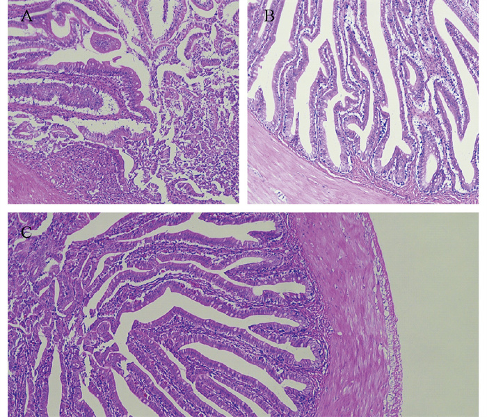 ( A:模型组;B:对照组;C:黄芩苷药物处理组。A: Model group; B: Control group; C: Baicalin-treated group. ) 图 10 肠道病理学观察(HE染色) Fig. 10 Intestinal pathological observation (HE staining) |