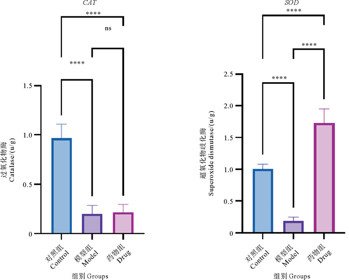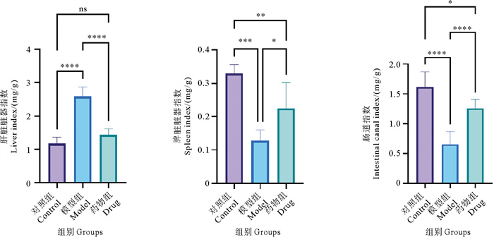( ns表示组间差异不显著,*表示组间差异显著(P < 0.05),**表示组间差异非常显著(P < 0.01),***表示组间差异极显著(P < 0.001),****表示组间差异超显著(P < 0.000 1)。ns indicates no significant difference between groups, * indicates a significant difference between groups (P < 0.05), ** indicates a very significant difference between groups (P < 0.01), *** indicates a highly significant difference between groups (P < 0.001), and **** indicates an extremely significant difference between groups (P < 0.000 1). ) 图 8 各组脏器指数 Fig. 8 Organ indices for each group |