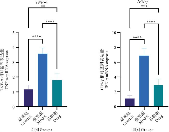 抗氧化指标结果如图 11所示。在SOD基因表达方面,模型组表达量最高,对照组最低,药物组介于两者之间(P < 0.001),这表明模型组存在氧化应激反应,导致SOD基因表达量升高,而黄芩苷药物处理能够部分缓解这种反应(见图 11)。抗氧化的炎症因子指标结果如图 12所示。药物组的表达水平介于对照组和模型组之间,且药物组与模型组、对照组在两种基因上都存在显著差异(P < 0.001),这表明药物处理对模型组的炎症反应有一定的缓解作用,但还不能完全将基因表达水平恢复到对照组的状态。各组脾脏中炎症相关基因IFN-γ和TNF-α的mRNA相对表达量存在显著组间差异。与空白组相比,模型组IFN-γ和TNF-α表达极显著升高(P < 0.001);25 mg/kg组IFN-γ表达显著低于模型组(P < 0.05),TNF-α表达极显著低于模型组(P < 0.001),表明该处理可显著调控脾脏炎症因子的基因表达水平。