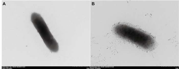 ( A: 电镜下正常菌体形态图;B:经黄芩苷处理后电镜下菌体形态图。A: Normal bacterial morphology under electron microscope; B: Morphology of the cells under electron microscope after baicalin treatment. ) 图 2 透射电镜下嗜水气单胞菌菌体形态图 Fig. 2 Morphology of Aeromonas hydrophila under transmission electron microscope |