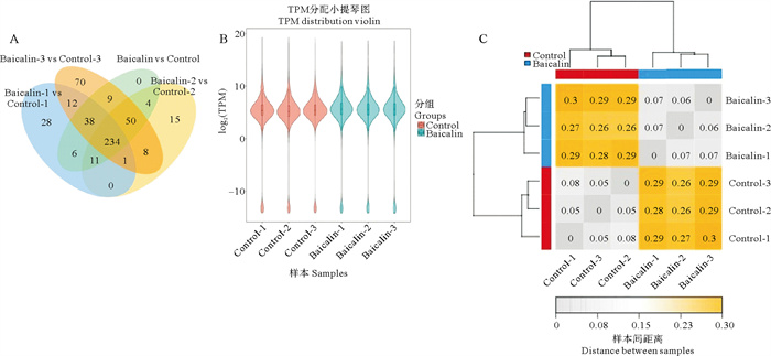 ( A:韦恩图,不同的颜色代表不同的组别。B:小提琴图,横坐标为样本名,纵坐标各样本基因表达量显示TPM+1的对数值。C:聚类热图,右侧和下侧为样本名,左侧和上侧显示样本聚类情况,不同颜色代表样本间相关系数的大小。Control为空白组,Baicalin为药物处理组。A: Venn diagram. Diffe-rent colors represent different groups. B: Violin plot. The horizontal coordinate is the sample name. The vertical coordinate shows the logarithm value of TPM+1 of each sample′s gene expression. C: Cluster heatmap. The right and lower sides are sample names. The left and upper sides show the sample clusteringsituation. Different colors represent the size of the correlation coefficient between samples. Control was the blank group, and Baicalin was the drug treatment group. ) 图 3 样本间的基因表达量及其差异性分析 Fig. 3 Gene expression and differential analysis among samples |
