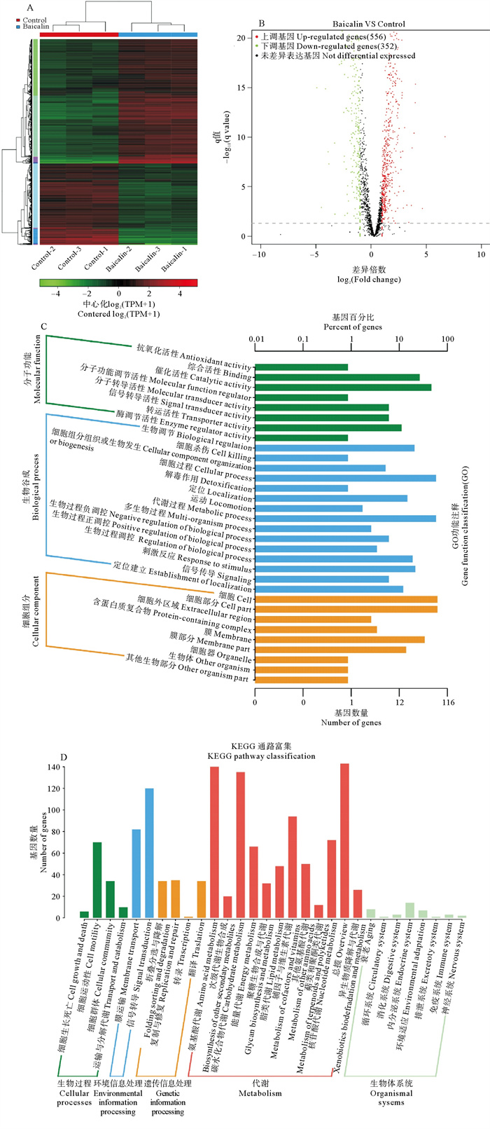 1.8 差异基因鉴定筛选、功能注释和富集分析通过StringTie进行转录本和基因重构,分析每个转录本在各样本中的表达量,利用GO功能注释和KEGG功能富集分析,筛选出差异基因及其涉及的通路,用FPKM表示结果。以|log2(Fold change)|≥1且P≤0.05作为差异基因的筛选阈值,运用软件DESeq2分析每个基因表达的差异性,并进行嗜水气单胞菌不同处理组(Control组和Baicalin组)的组间比较,进而研究差异基因的功能。