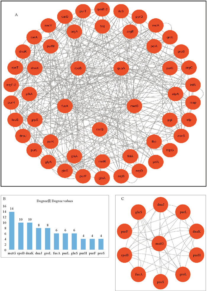对差异基因构建蛋白互作网络并进行节点度(Degree)分析,结果如图 5A所示。在这些基因中,有51个蛋白质展现出良好的互作能力。图 5B显示,metG(Degree=14)在网络中连接作用最核心,rpoB、dnaK(Degree=10)、dnaJ、groL(Degree=8)、fusA、purL、glnS(Degree=6)、purH、purF、proS(Degree=4)等基因是黄芩苷作用于嗜水气单胞菌的关键调控靶点。通过Cytoscape的CytoHubba插件进行核心蛋白质筛选,结果如图 5C所示,其中11个蛋白质被识别为核心蛋白质。
