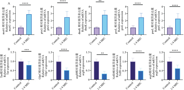( 图A为上调基因;图B为下调基因。Control代表对照组;1/4 MIC代表特定浓度黄芩苷处理组;MIC表示最小抑菌浓度,即最小能抑制可见细菌生长的药物浓度。**表示组间差异显著(P < 0.05),***表示组间差异高度显著(P < 0.01),****表示组间差异极显著(P < 0.001)。Figure A shows upregulated genes, and Figure B shows downregulated genes. Control represents the control group, and 1/4 MIC represents the specific concentration of baicalin treatment group; MIC stands for minimum inhibitory concentration, which is the minimum concentration of a drug that can inhibit the growth of visible bacteria. ** indicates a significant difference between groups (P < 0.05), *** indicates a highly significant difference between groups (P < 0.01), and **** indicates an extremely significant difference between groups (P < 0.001). ) 图 6 差异基因RT-qPCR验证结果 Fig. 6 RT-qPCR validation results of differential genes |