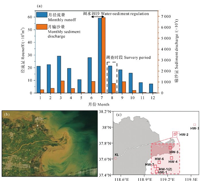 ( (a)2022年黄河利津水文站月径流量和月输沙量(数据引自黄河2022年泥沙公报,http://www.yrcc.gov.cn/);(b)2022年8月黄河口卫星图;(c)采样站位。(a) Monthly water and sediment discharge at the Lijin Hydrological Station of the Yellow River in 2022 (data from the Yellow River Sediment Bulletin 2022, http://www.yrcc.gov.cn/); (b) Satellite map of the Yellow River Estuary in August, 2022; (c) Sampling station. ) 图 1 研究区域及采样站位 Fig. 1 Study area and sampling station |