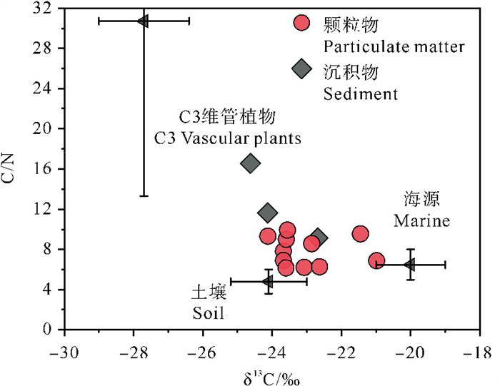 式中:C/Nsample和δ13Csample代表所测样品的C/N比和δ13C值,fmarine、fsoil、fC3分别代表海源、土壤和C3维管植物有机碳的贡献比例,其余符号代表相对应来源的端元值。在前人研究基础上[9, 20-21],采用土壤端元δ13C值为(-24.1±1.1)‰和C/N值为4.8±1.2,C3维管植物端元δ13C值为(-27.7±1.3)‰和C/N值为30.7±17.4,海源有机碳端元δ13C值为(-20.0±1.0)‰和C/N值为6.5±1.5(见图 2)。使用蒙特卡洛模拟方法对端元混合模型求解,该方法假定端元值在给定范围内正态分布,在此范围内随机选取1亿个符合正态分布的数值,然后按照正态分布在其中选择100万个满足公式的数值进行计算,可以得到土壤、C3维管植物和海源有机碳的平均贡献比例。