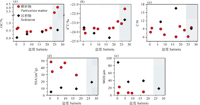 ( (a) 颗粒物和沉积物OC含量;(b) 颗粒物和沉积物δ13C值; (c) 颗粒物和沉积物C/N比; (d) 颗粒物和沉积物SSA; (e) 颗粒物和沉积物MGS。(a) OC content of particulate matter and sediment OC content; (b) δ13C values of particulate matter and sediment; (c)C/N ratios of particulate matter and sediment; (d)SSA of particulate matter and sediment; (e)MGS of particulate matter and sediment. ) 图 4 黄河口颗粒物和沉积物有机碳参数和矿物特征参数随盐度的分布特征 Fig. 4 The distribution characteristics of organic carbon parameters and mineral characteristic parameters of particulate matter and sediment in the Yellow River Estuary with salinity |