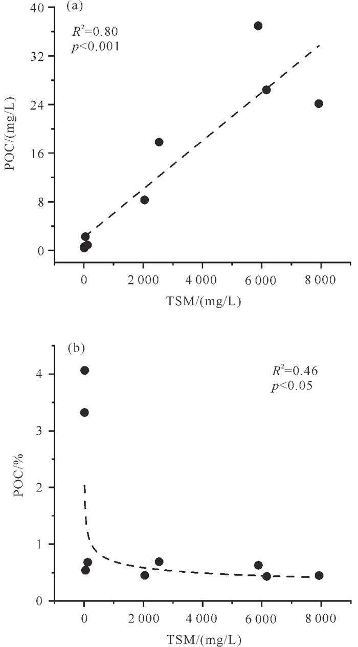 POC%是TSM的重要性质,可以反映颗粒物的来源。本研究发现在TSM浓度大于45 mg/L的高浑浊度区域POC%较为稳定,平均值为0.55%,与Cauwet等[7]1985年在黄河测得的POC含量0.5%以及Gu等[29]2004—2006年在黄河口高浑浊区域测得的POC含量0.5%接近,河口近岸海域POC来源主要为河流陆源输入。中低盐度海域POC%略低于黄河POC%值,可能由于水动力过程导致的再悬浮向水体输送有机碳含量较低的颗粒物,使得POC%受稀释作用影响而降低(见图 5(a))。高盐度海域,POC%迅速升高至超过4%(见图 5(b)),此时可能由于水体透光性增强,海源初级生产对颗粒有机碳的贡献增大。此外,水动力分选作用下,易于吸附保存有机碳的细粒径颗粒物容易被输送到高盐度海域从而导致POC%升高,但是考虑到中低盐度海域水体颗粒物总体为MGS < 8 μm的细颗粒,选择性输运可能不是高盐度海域POC%升高的主要因素,因此,高盐度海域海洋初级生产对POC%的贡献占主导。