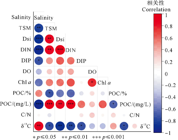 图 6 黄河口环境参数与总有机碳各项参数斯皮尔曼相关性分析 Fig. 6 Spearman Correlation analysis of environmental parameters and total organic carbon parameters in the Yellow River Estuary |