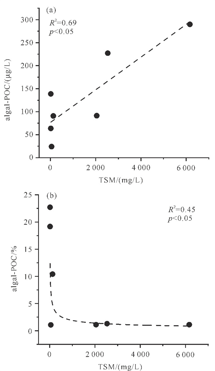 为探究河口POC来源和空间分布的影响因素,对总有机质和环境各项参数做相关性分析(见图 6)。结果显示POC的δ13C、POC%与TSM呈负相关关系,δ13C值与盐度呈正相关关系,有机碳的分布主要受到来源控制。黄河输送的泥沙主要来自黄土高原的土壤侵蚀,悬浮颗粒物POC含量较低[30],中低盐度受黄河高含沙量径流输入的影响POC%和δ13C均较低,显示出较强的陆源有机碳输入信号;高盐度区域受黄河输入减弱的影响,TSM降低,POC%、δ13C值和Chl a浓度均升高表明海洋浮游藻类对POC的贡献增多(见图 3(c)和图 4(b))。Chl a与TSM存在正相关关系,尽管相关性不显著,但是在一定程度上表明中低盐度的高浑浊海域有着较高的初级生产。为了进一步分析河口有机碳的来源的变化,利用Chl a评估河口浮游植物来源(自生源)有机碳(algal-POC)的贡献,通常用Chl a的浓度乘以系数60计算[28]。自生源有机碳的浓度以及占POC的百分比(algal-POC%)与TSM的关系如图 7所示。在TSM浓度较高的低盐度海域自生源有机碳浓度较高,DIN、DIP与TSM呈显著正相关关系(见图 6),表明河流淡水输入的高浓度的营养盐导致中低盐度浮游植物的初级生产较高。algal-POC%与TSM呈现负指数关系(见图 7(b)),虽然近岸海域浮游植物自生源有机碳浓度较高,但河流输入的大量土壤侵蚀来源的有机碳稀释了自生源有机碳,在中低盐度海域自生源有机碳对POC的贡献小于5%,POC来源主要以河流陆源输入为主。当TSM < 150 mg/L时,浮游植物生产的贡献明显增加,这与POC%的结果一致(见图 5(b))。