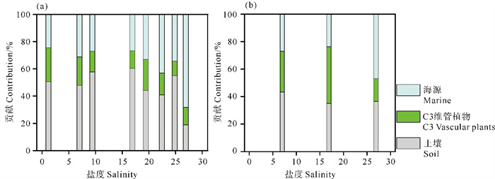 (3) 基于C/N比和δ13C的蒙特卡洛三端元混合模型的计算结果表明,黄河口颗粒有机碳由土壤和海源有机碳占主导,土壤来源有机碳在中低盐度区域的贡献超过50%,随离岸距离增加而减少至19%,而海源有机碳的贡献逐渐增加至68%。沉积物中土壤来源有机碳的贡献约占40%,变化幅度较小;海源有机碳的贡献表现出增加的趋势,C3维管植物来源的有机碳主要分布在近岸。