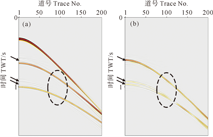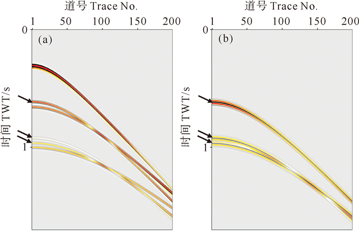 2 理论模型实验建立多次波同相轴与一次波同相轴具有较小时差的理论模型,然后采用主频为35 Hz的雷克子波作为震源,通过弹性波方程的有限差分模拟得到含有多次波的原始地震记录。图 1(a)展示了原始记录,每炮200道,最小偏移距为0 m,道间距为10 m。应用基于反馈环理论的自由界面多次波预测方法,可得到仅包含多次波的炮集记录如图 1(b)所示,箭头所示位置即为多次波同相轴,其与有效信号时差较小。