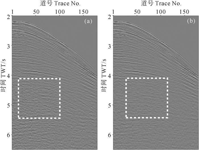 对比图 7—图 9可知,在一次波偏移速度场下进行成像时,尽管多次波已经得到了部分压制,但在图 7的虚线框区域,仍然可以看到明显的多次波同相轴。通过对比图 8和图 9中两种多次波压制方法的结果,可以发现,基于时域变换道曲波域滤波的多次波匹配衰减方法(即本文方法)所得的剖面中,虚线框内的强多次波同相轴几乎完全消除,而常规曲波变换处理后的剖面中仍然存在明显的多次波残余,由此进一步验证,本文提出的方法在复杂崎岖海底环境中,相较于传统的曲波变换方法,不仅能够更好地保留一次波信息,还显著提升了多次波的压制效果,从而可获得更加清晰和精确的地震成像结果。
