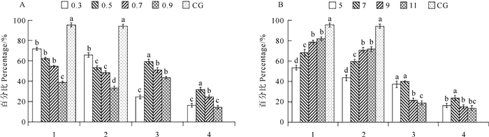 ( A. CB诱导组,图示0.3、0.5、0.7和0.9为不同诱导浓度(mg/L),图示CG为对照组。B. 低渗诱导组,图示5、7、9和11为不同盐度,图示CG为对照组。横坐标中,1表示卵裂率,2表示孵化率,3表示三倍体率,4表示综合评价指数。不同字母上标表示差异显著(P < 0.05),下同。A. CB induction group, the sample graphs 0.3, 0.5, 0.7, and 0.9 show different induction concentrations(mg/L), the sample graph CG show control group. B. Hyptonic induction group, the sample graphs 5, 7, 9, and 11 show different salinities, the sample graph CG show control group. In the horizontal coordinate, 1 represents the cleavage rate, 2 represents the hatching rate, 3 represents the triploidy rate, 4 represents the comprehensive evaluation index. Different superscript letters indicate significant differences (P < 0.05), and the same applies below. ) 图 1 不同CB浓度和盐度诱导岩牡蛎三倍体的卵裂率、孵化率、三倍体率和综合评价指数 Fig. 1 Cleavage rate, hatching rate, triploidy rate, and comprehensive evaluation index for inducing triploidy in Crassostrea nippona under different CB concentrations and salinities |
