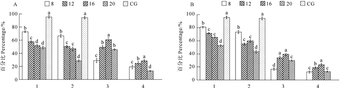 ( A. CB诱导组。B. 低渗诱导组。图示中,8、12、16和20为不同诱导持续时间(min),CG为对照组。横坐标中,1表示卵裂率,2表示孵化率,3表示三倍体率,4表示综合评价指数。A. CB induction group. B. Hyptonic induction group. The sample graphs 8, 12, 16, and 20 show different induction durations(min), the sample graph CG show control group. In the horizontal coordinate, 1 represents the cleavage rate, 2 represents the hatching rate, 3 represents the triploidy rate, 4 represents the comprehensive evaluation index. ) 图 2 不同诱导持续时间下诱导岩牡蛎三倍体的卵裂率、孵化率、三倍体率和综合评价指数 Fig. 2 Cleavage rate, hatching rate, triploidy rate, and comprehensive evaluation index for inducing triploidy in Crassostrea nippona under different induction durations |
