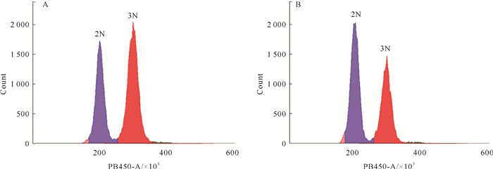 ( A. CB诱导组。B. 低渗诱导组。横坐标中,PB450-A表示荧光素标记抗体;纵坐标中,Count表示被荧光标记的细胞数量。A. CB induction group. B. Hyptonic induction group. In the horizontal coordinate, PB450-A indicate the fluorescently labeled antibody; in the vertical coordinate, Count indicate the number of cells labeled with fluorescence. ) 图 3 不同诱导方法诱导岩牡蛎三倍体的幼虫倍性 Fig. 3 Larval ploidy of triploid Crassostrea nippona under different induction methods |