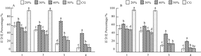 ( A. CB诱导组。B. 低渗诱导组。图示中,20%、30%、40%和50%为不同诱导处理时机,CG为对照组。横坐标中,1:卵裂率;2:孵化率;3:三倍体率;4:综合评价指数。A. CB induction group. B. Hyptonic induction group. The sample graphs 20%, 30%, 40%, and 50% show different induction treatment timings, the sample graph CG show control group. In the horizontal coordinate, 1 represents the cleavage rate, 2 represents the hatching rate, 3 represents the triploidy rate, 4 represents the comprehensive evaluation index. ) 图 4 不同诱导处理时机下诱导岩牡蛎三倍体的卵裂率、孵化率、三倍体率和综合评价指数 Fig. 4 Cleavage rate, hatching rate, triploid rate, and comprehensive evaluation index of triploid Crassostrea nippona under different induction treatment timings |
