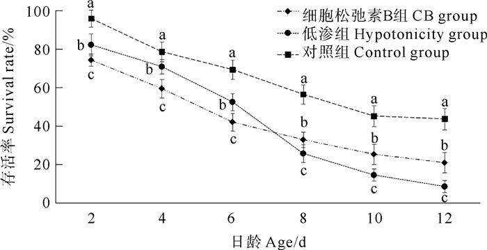 2.4 不同诱导方法对岩牡蛎幼虫三倍体率的影响在幼虫存活率方面,CB组和低渗组的幼虫存活率始终低于对照组,CB组幼虫存活率在6日龄之前显著低于低渗组(P < 0.05),但8日龄之后CB组显著高于低渗组(P < 0.05)。CB组在12日龄的幼虫存活率为(20.97±5.25)%,低渗组为(8.63±2.14)%,对照组为(43.69±6.58)%。2日龄幼虫存活率对照组显著高于低渗组和CB组(P < 0.05),低渗组显著高于CB组(P < 0.05);4日龄结果与2日龄相同;6日龄幼虫存活率对照组显著高于低渗组和CB组(P < 0.05),低渗组高于CB组,但无显著性差异(P>0.05);8~12日龄幼虫存活率对照组显著高于CB组和低渗组(P < 0.05),CB组显著高于低渗组(P < 0.05,见图 5);在6~8日龄期间,低渗组出现了大规模死亡,存活率低于CB组。