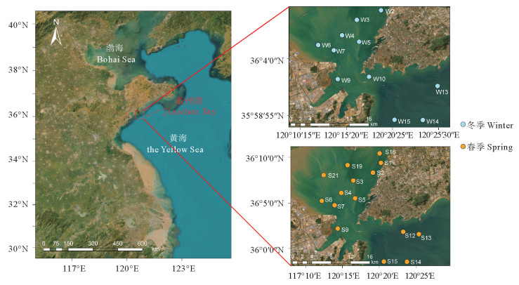 图 1 胶州湾海域冬、春季调查站位 Fig. 1 Sampling sites in Jiaozhou Bay in winter and spring |