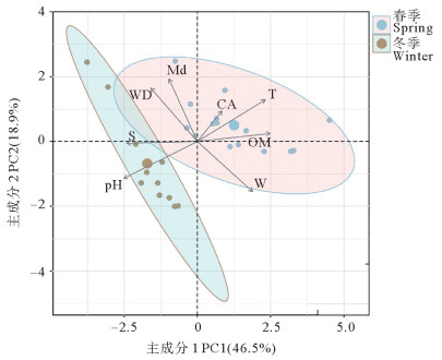 PCA分析结果显示,PC1与PC2累计可解释环境变异度的65.4%,PC1轴的贡献率为46.5%(见图 2)。PC1贡献较大的因子依次为pH(-0.448)、有机质含量(0.444)、底层水盐度(-0.431)、底层水温度(0.414)和沉积物含水量(0.336);对PC2贡献较大的因子依次为沉积物中值粒径(0.542)、水深(0.460)、沉积物含水量(-0.432)、底层水温度(0.361)和pH(-0.319)。冬、春季站位明显分离。冬季站位主要集中在第三象限,与pH正相关; 春季站位主要集中在第一象限,与底层水温度、有机质含量和叶绿素a均正相关。