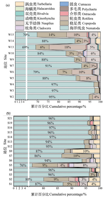 ( ((a)冬季Winter; (b)春季Spring) ) 图 3 胶州湾海域小型底栖动物各类群丰度占比 Fig. 3 Abundance percentage of each meiofauna taxon in Jiaozhou Bay |