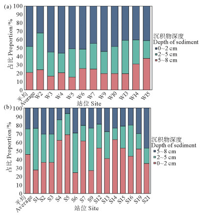 ( (a)冬季Winter; (b)春季Spring ) 图 5 胶州湾冬、春季小型底栖动物丰度在沉积物中的垂直分布 Fig. 5 Vertical distribution of meiofaunal abundance in Jiaozhou Bay |