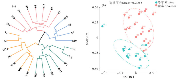 图 6 胶州湾调查站位冬、春季小型底栖动物丰度的Cluster (a)和NMDS (b)图 Fig. 6 Cluster (a) and NMDS plots (b) of the meiofauna community structure in Jiaozhou Bay in winter and spring |