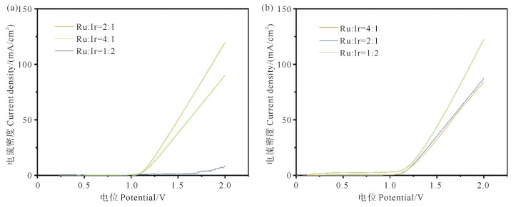 2 结果与讨论 2.1 电极表征分析 2.1.1 电化学性能分析为优化电极材料,对材料进行电化学测试确定最佳掺杂比例。在电化学反应中,析氯反应和析氧反应表现为缩放关系[26],因此反应测试了Ru∶Ir分别为2∶1、1∶2、4∶1时电极的析氯电位和析氧电位。根据图 1(a),Ru∶Ir为4∶1时电极的析氯电位为1.07 V左右,析氯电位最低,Ru∶Ir为1∶2时电位为1.13 V,这是由于Ru的析氯电位低,其本身析氯反应活性比Ir高,掺杂Ru有利于析氯反应的进行。氧化铱虽然电催化活性略低于氧化钌,但其具有更长的使用寿命和较好的稳定性,Ir的加入,可以增加电极表面的活性位点,具有良好的导电性,能够与其他材料产生协同作用。如图 1(b)所示,Ru∶Ir从4∶1变为2∶1时,电极的析氧电位从1.16 V增加到1.17 V,而当Ru∶Ir为1∶2时,电位为1.20 V,说明提升电极中铱的占比,有利于改善电极的析氧稳定性,从而提高电极在碱性条件下的稳定性和耐久性。当电催化反应体系以氯化物为电解质时,存在大量的氯离子,使得钌比铱的反应速度快,从而与溶液交换的电子多,析氯反应的进行有利于产生更多的氯氧化物,促使目标污染物的灭活,对比电极电位差发现,钌铱比为4∶1时,氯氧电位差更大,这意味着其具有更高的电流效率,因此选用Ru∶Ir为4∶1的电极比例。