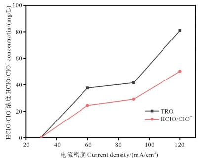 图 10 电催化生成HClO/ClO-与TRO对比 Fig. 10 The generation of HClO/ClO- compared to TRO under electrocatalytic |