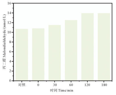 2.3.5 电催化过程MDA含量变化情况电解过程导致氧化性物质的产生,微藻细胞受到氧化作用,会诱导发生相应氧化作用和酯化过氧化反应[36]。丙二醛MDA是衡量酯化过氧化结果中膜脂质损伤的程度的重要指标,即可以反映细胞损伤程度[37]。实验测定了赤潮异弯藻经历电催化过程产生的MDA来检测藻细胞的损伤程度,进一步说明电解作用对微藻灭活的作用,结果如图 11所示。实验测定了电解处理前后藻液中MDA的含量,结果表明微藻处理后藻液中MDA浓度均高于处理前,说明电催化作用产生的氧化性物质破坏了细胞结构,导致细胞存在不同程度的损伤,同时引起细胞内蛋白质、脂质及核酸变性,进一步证实了电解灭活微藻的作用。