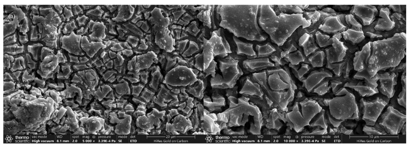 实验使用扫描电子显微镜对制备的电极进行表面形貌进行观察。如图 2所示,电极具备粗糙或不规则的表面,表面装饰有晶体,可能是RuO2或IrO2的粒子覆盖于Ti载体上的Ru和Ir氧化物表现为相互叠加的形态,呈现梯田状,这可能是因为涂层的可塑性引起的机械应力以及煅烧过程中形成的基材和薄膜之间的热膨胀系数差异造成的[27]。电极表面呈现的下层梯田通过凹槽支撑上层梯田,这种形态被称为裂泥纹理[28]。裂纹的出现能够增加涂层的有效表面积,当有效表面积增大后,在相同的电流输入情况下,实际分布在单位面积上的电流密度会相应降低,使得阳极表面各部分所承受的电流负荷减小,有助于减缓其因电流作用而引发的腐蚀、损耗等现象。这也是析气反应的主要发生地,一定程度的裂纹有利于进行析气反应,有利于电极析出的物质充分作用于微藻液,改善电极的电化学性能。