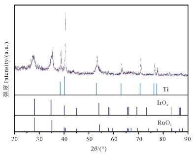 图 3 电极Ti/RuO2-IrO2-SnO2-Sb的XRD图谱 Fig. 3 XRD pattern of Ti/RuO2-IrO2-SnO2-Sb electrode |