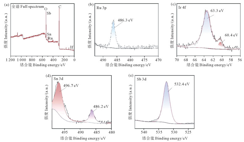 为进一步分析电极材料元素价态及组成,通过XPS分析确定所制备的阳极表面层上元素的化学状态。根据不同轨道区域的结合能值可以确定金属的氧化态及化学配位环境,XPS图谱可以观察到Ru 3p、Ir 4f、Sn 3d和Sb 3d轨道的能峰(见图 4(a)),表明复合电极材料中包含以上元素。根据Ru 3p、Ir 4f的XPS能谱分析结果,Ru 3p 3/2、和Ir的Ir 4f 5/2、Ir 4f 7/2轨道结合能数值分别为486.3、60.4、63.3 eV,Ir 4f峰分裂成4f 5/2和4f 7/2是由于4f轨道的自旋-轨道耦合[29],这个峰的出现是由于射出的光电子穿过价带时库仑势的突然变化(见图 4(b)、4(c))。图 4(d)中Sn 3d的高分辨率光谱所示的Sn表现为486.2和496.7 eV两个峰值,分别代表Sn 3d 5/2和Sn d 3/2[30]。图 4(e)中,结合能在532.4 eV的Sb 3d轨道代表Sb5+,可以归属于3d 5/2,图谱分析结果验证了材料的多元素协同效应。