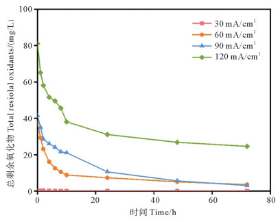 总剩余氧化物在电催化过程中对微藻灭活起重要作用,实验对比了不同电流密度条件下(30、60、90和120 mA/cm2)总剩余氧化物的产生和衰减过程,从而揭示微藻持续灭活的原因。如图 8所示,以赤潮异弯藻为研究对象,其他条件保持不变的情况下,电催化体系在30、60、90和120 mA/cm2电流密度下产生的初始TRO分别是0.4、37.6、41.6和81.1 mg/L,由此可见,随着电流密度的增加,电极发生化学反应速率加快,体系产生的TRO逐渐增加,从而能加速赤潮异弯藻的灭活,这与电流密度不同时,赤潮异弯藻的灭活情况是一致的。此外,实验测定了随着时间增加,TRO的衰减情况,10 h后,各电流密度下TRO分别衰减到0.2、8.9、21.1、38.1 mg/L,分别衰减了46.2%、76.3%、49.2%、53.0%。而后衰减速率逐渐放缓,出水TRO含量较低。