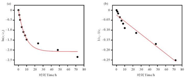图 9 TRO衰减的一阶(a)和二阶(b)动力学拟合 Fig. 9 First-order (a) and Second-order (b) kinetic modeling of TRO attenuation |