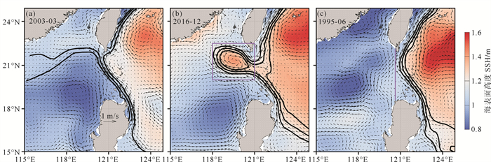 ((a)—(c)对应Leaking、Looping及Leaping流径的典型特征。其中黑色实线代表黑潮主轴,选自吕宋岛以东17.5°N断面经向流速最大值附近对应的SSH等值线,间隔0.05 m;图(b)紫色方框代表黑潮流套指数KLI计算区域;图(c)紫色实线为120.6°E经线,用于计算表层吕宋海峡通量LSTsur。(a)—(c) represent the typical characteristics of Leaking, Looping, and Leaping paths. The black solid lines represent the Kuroshio axes, selected using the SSH contours with an interval of 0.05 m, corresponding to the vicinity of the maximum meridional velocity along the 17.5°N section east of Luzon Island, with an interval of 0.05 m. The purple box in (b) represents the calculation region of Kuroshio Looping index (KLI). The purple line in (c) represents 120.6°E meridional line, which is used to calculate the LSTsur.) 图 1 吕宋海峡处黑潮3种典型流径下的月平均海表面高度与绝对地转流分布图 Fig. 1 Distributions of monthly SSH and absolute geostrophic current corresponding to three typical Kuroshio paths in the Luzon Strait |