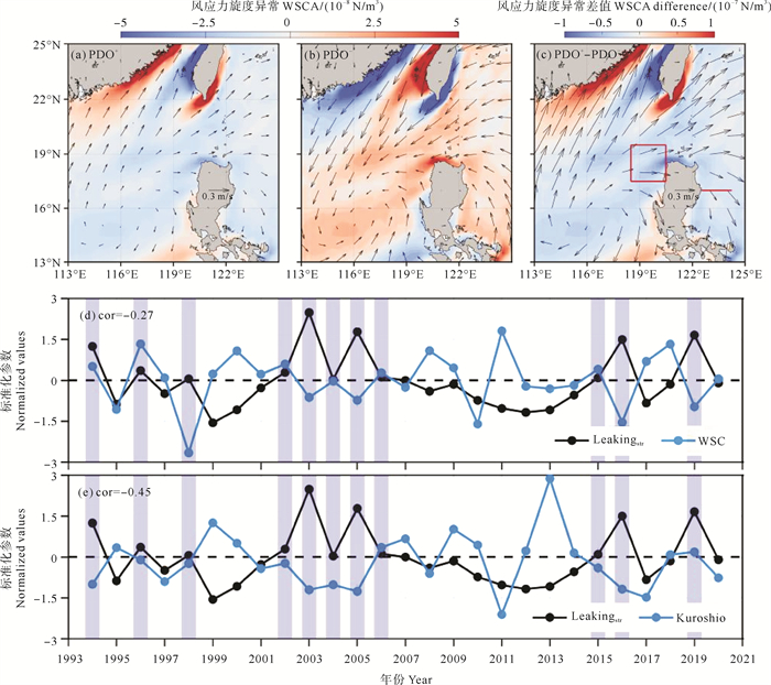 ((a)、(b) PDO正(负)相位期间风应力旋度异常与风场异常空间分布图。(c) PDO正负相位作差得到的风应力旋度异常与风场异常空间分布图,红色方框代表吕宋西北侧WSC计算区域,红色曲线表征上游黑潮强度断面。(d)、(e) Leakingstr与WSC、上游黑潮强度时间序列曲线。(a), (b) Composite distributions of wind stress curl anomalies and wind vector anomalies during the positive (negative) PDO phases. (c)Differences in WSCA and wind vector anomalies between positive and negative PDO phases, the red box in (c) indicates the region to calculate the WSC, and the red line represents the section to calculate the upstream Kuroshio strength. (d), (e) Time series of Leakingstr, WSC, and upstream Kuroshio strength.) 图 10 PDO正负相位的风应力旋度异常合成分析,Leaking流径强度指数与风应力旋度、上游黑潮强度的相关性分析 Fig. 10 Composite analysis of wind stress curl anomalies under positive and negative PDO phases, and correlation analysis between the Leaking intensity index, WSC and upstream Kuroshio intensity |