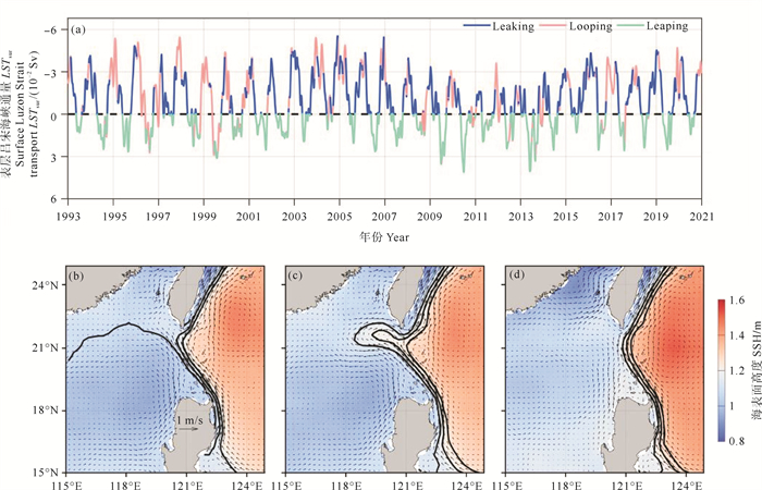 2 结果与分析 2.1 识别结果展示基于1.4节中描述的方法,我们识别出了1993—2020年间黑潮3种流径的发生时刻。图 2(a)呈现了LSTsur的时间序列变化。从图 2可以看出,Leaping流径主要发生在夏季,通常对应正值的LSTsur;Looping流径则主要出现在冬季,多对应负值的LSTsur,但部分时段也出现正值;Leaking流径主要发生在冬半年,且LSTsur均为负值,代表黑潮入侵南海。统计分析表明,在1993—2020年期间,Leaking、Looping和Leaping流径的发生天数分别为4 102、2 913和3 212 d,对应的发生概率分别为40.1%、28.5%和31.4%。由此可见,Leaking流径的发生概率最高,Leaping流径则次之,而Looping流径的发生概率最低。