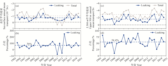 (图(a)为黑潮Leaking流径表层年平均通量与吕宋海峡表层年平均通量的对比;图(b)为黑潮Leaking流径表层年平均通量占吕宋海峡表层年平均通量的百分比。图(c)、(d)与(a)、(b)类似,但为上层500 m吕宋海峡平均通量结果。图(a)与图(c)中“Total”分别表示吕宋海峡表层和上层500 m年平均通量。(a) Comparison between annual-mean sea surface transport during the Leaking paths and the total annual-mean sea surface transport in the Luzon Strait. (b) Percentage of annual-mean sea surface transport during the Leaking paths relative to the total annual-mean sea surface transport in the Luzon Strait. (c), (d) same as (a), (b), but for the results of the upper 500 m Luzon Strait volume transport. The word "Total" in (a) and (c) denotes the annual mean LST at the sea surface and in the upper 500 m, respectively.) 图 3 Leaking流径对吕宋海峡表层及上层500 m体积输运的贡献 Fig. 3 Contributions of the Leaking path to the volume transports at the sea surface and in the upper 500 m through the Luzon Strait |