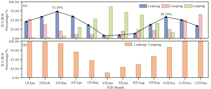 黑潮入侵南海并非持续性现象,而是呈现间歇性特征[20]。不同的入侵流径展现出显著的季节性变化特征,这一现象已得到广泛研究。Looping流径有时会在台湾岛西南部脱落,形成反气旋式涡旋,进而对南海的温盐收支产生重要影响[14, 21]。前人研究一致认为,Looping流径主要发生在冬季,而Leaping流径在夏季具有较高的发生概率[17, 19]。而对于Leaking流径,前人研究发现其在非夏季(春、秋、冬三季)发生概率较大,但对于其逐月分布特征尚不清晰,仍需更多探究[17, 19]。同时,前人研究发现,吕宋海峡流径的季节性变化主要受到南海东北部季风的季节性变化以及上游黑潮强度的周期性波动的影响[22-26]。