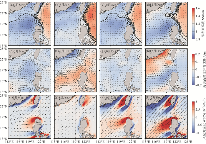 Leaking流径在冬半年较强,呈现明显的双峰型季节变化特征。为了进一步探讨Leaking流径季节性变化的调控机理,本文选取了3、6、10和12月(分别对应Leaking、Leaping和Looping流径发生概率较高的时段),对其气候态平均的海表面高度场、地转流场以及二者的异常场、风场和风应力旋度场进行了分析(见图 5)。这4个月分别对应Leaking、Leaping和Looping流径发生概率较高的时间段。图 5显示:3和10月,黑潮以Leaking流径的形式入侵南海,黑潮的一个分支在吕宋海峡中部向西进入南海,吕宋海峡区域的海表纬向流速异常为负,吕宋岛西北部呈现负的海表高度异常;12月,黑潮以Looping流径入侵南海,台湾西南部流场异常呈现反气旋式环流分布特征,同时台湾西南和吕宋西北分别表现为正的和负的海表高度异常;6月,黑潮表现为Leaping流径,并未入侵南海,吕宋海峡处的纬向流速异常为正,台湾西南和吕宋西北则分别呈现负的和正的海表高度异常。