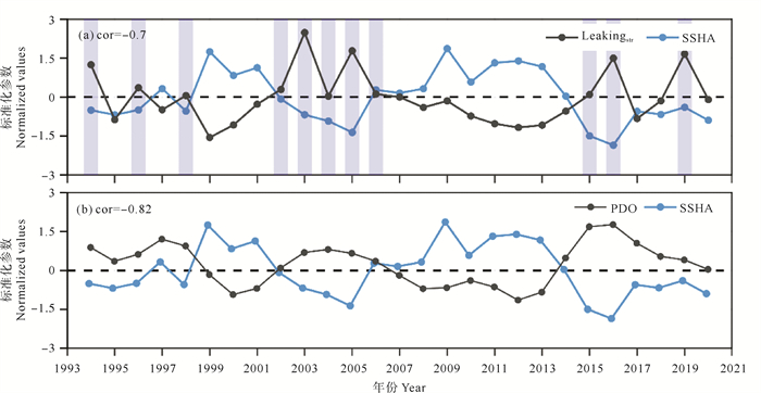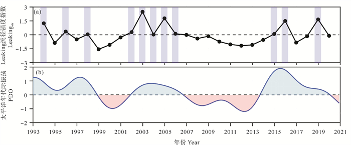 ((a)蓝色阴影代表强Leaking流径事件;(b)蓝色(红色)阴影表示PDO处于正(负)相位。(a) Blue shadings represent strong Leaking path events; (b) Blue (red) shadings denote positive (negative) PDO phases.) 图 6 1993—2020年Leakingstr与PDO时间序列曲线图 Fig. 6 Time series of Leakingstr and PDO between 1993 and 2020 |