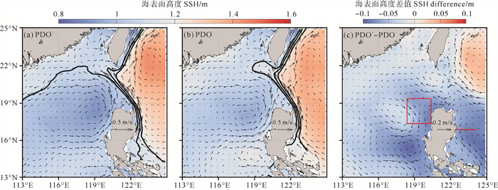 由于强Leaking流径事件主要发生在PDO正相位期间,而PDO负相位时Leaking流径强度显著减弱,因此本研究对PDO正相位和负相位期间冬半年的海表面高度场及流场进行合成(见图 7(a)、(b))。结果表明,在PDO正相位期间,太平洋黑潮主要以Leaking流径形式入侵南海东北部海域,此时吕宋岛西北海域的海表高度较低,最低值可达0.8 m;而在PDO负相位期间,黑潮则更接近于Looping流径结构特征,黑潮入侵南海较弱,吕宋岛西北海域的海表高度高于PDO正相位期间,最低值为0.9 m。通过对PDO正、负相位期间海表面高度场及流场作差分析(见图 7(c)),发现在吕宋海峡及其西侧海域存在显著的西向流异常,这表明PDO正相位期间Leaking流径更强,吕宋海峡向南海的水体输运通量更大,这一结果揭示了PDO周期性振荡对黑潮入侵流径的重要调节作用。此外,PDO正相位期间吕宋岛西北较低的海表高度以及吕宋岛东侧相对较弱的黑潮流速,进一步表明这两个因素可能共同调控了Leaking流径的强度变化。具体而言,吕宋岛西北较低的海表高度可能增强了吕宋海峡南北两侧的压力梯度,而吕宋岛东侧较弱的黑潮流速则降低了黑潮主轴的惯性,二者共同促进了黑潮以Leaking流径形式入侵南海。