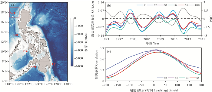((a)红星表示站点S1—S5的位置,红色方框表示吕宋岛西北侧风应力旋度计算区域;(b)不同站点海面高度异常与PDO时间序列曲线图;(c)站点S2—S5与站点S1超前滞后曲线。(a)The red stars represent the locations of stations S1—S5, the red box indicates the region for calculating wind stress curl in the northwest of Luzon Island; (b) Time series of SSHA and PDO of different stations; (c) Lead-lag curves between stations S2—S5 and station S1.) 图 9 菲律宾沿岸地形、不同站点SSHA与PDO时间序列及其超前滞后关系 Fig. 9 Topography along the Philippines coast, time series of SSHA and PDO of different stations, and their lead-lag relationships |